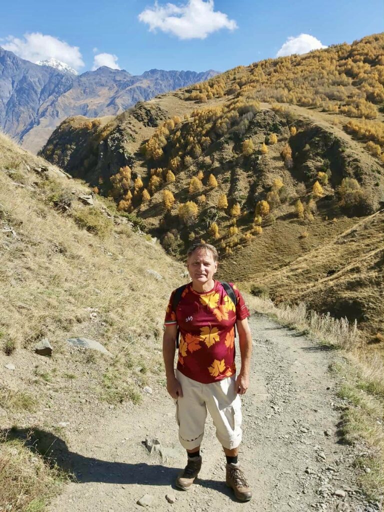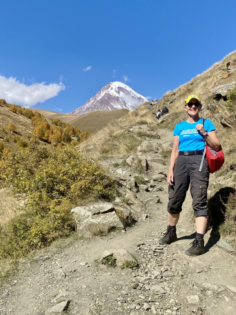 Vi steg upp tidigt på onsdag morgon för heldagsvandringen som startar strax utanför vår hotell. Vandringen är inte speciellt lång (11 km) men den lyfter oss över 1.000 höjdmeter som ska besegras såväl upp som ner. Vi startade på 1.700 möh och vandringen var riktigt brant redan från start, så pulsen steg raskt. På vägen passerar vi den vackert belägna Gergeti Trinity-kyrkan, förmodligen det mest berömda och mest fotograferade georgiska landmärket (som slöa kineser tog taxi upp till) och sen vidare mot glaciären. Så blev det inte, vi valde att vända vid trädgränsen (2.700 möh) men njöt av fri sikt mot Georgiens högsta berg (finns två högre, men de är numera i de av ryssarna ockuperade (Sydossetien/Abchasien).