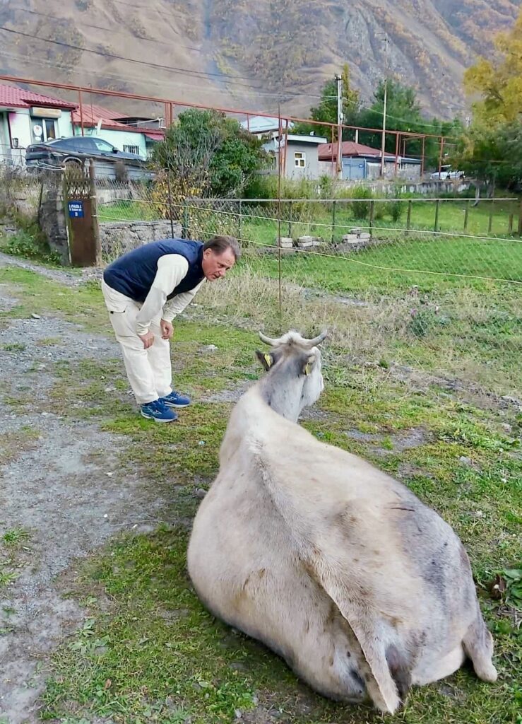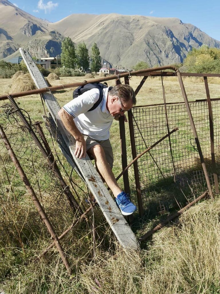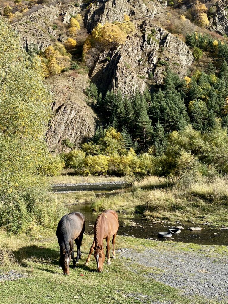 Över den också in mot ett stängslat gärde. Vi tar långa benet före det korta över ett staket, och är inlåsta, men hittar till slut ett hål ut. Nya bäckar korsar vår väg, vi möter frisläppta hästar, undviker havtornsbuskars törnen och når ut till stora landsvägen mot Stepansminda och Ryssland.