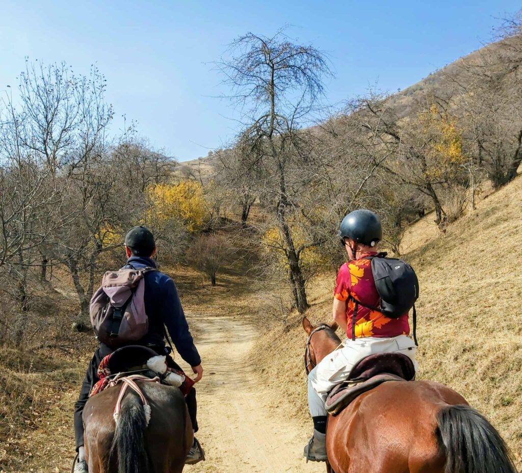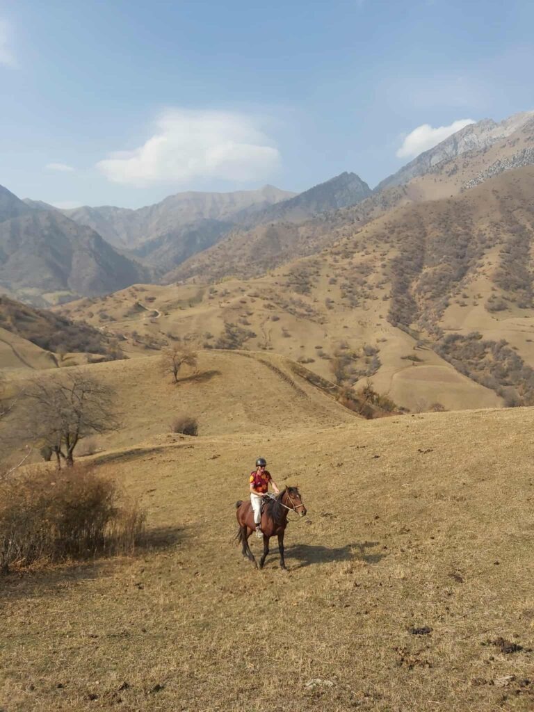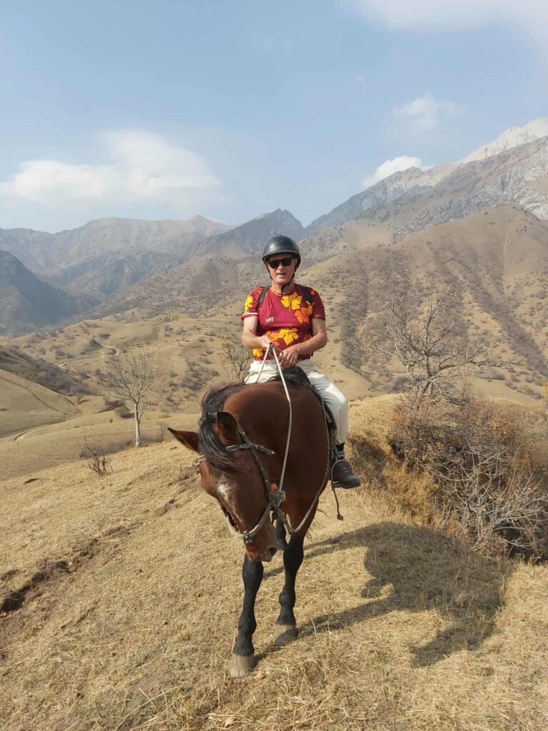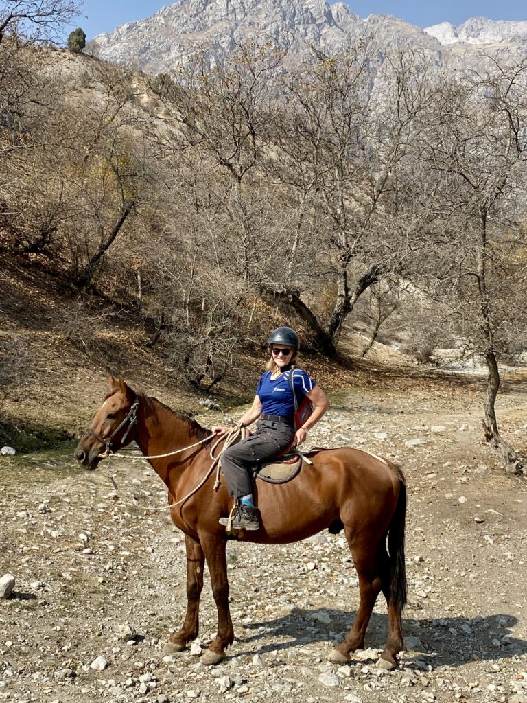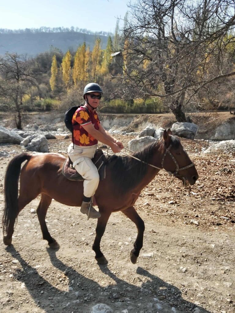 Tredje dagen i lilla byn fick vi kliva upp i sadlarna igen. Jag med starka stoet Toro, som tålmodigt skrittade uppför branterna till +2.000 meters jöjd. Svindlande vackert, och så rofyllt. Vår guide, Daler, infödd Arslanbobare, berättade om byn, om skolgång, skatter och den stora viljan att hjälpa till i lokalsamhället, helt utan betalning. Efter 5 timmar på hästryggen känns det reååält i kroppen.