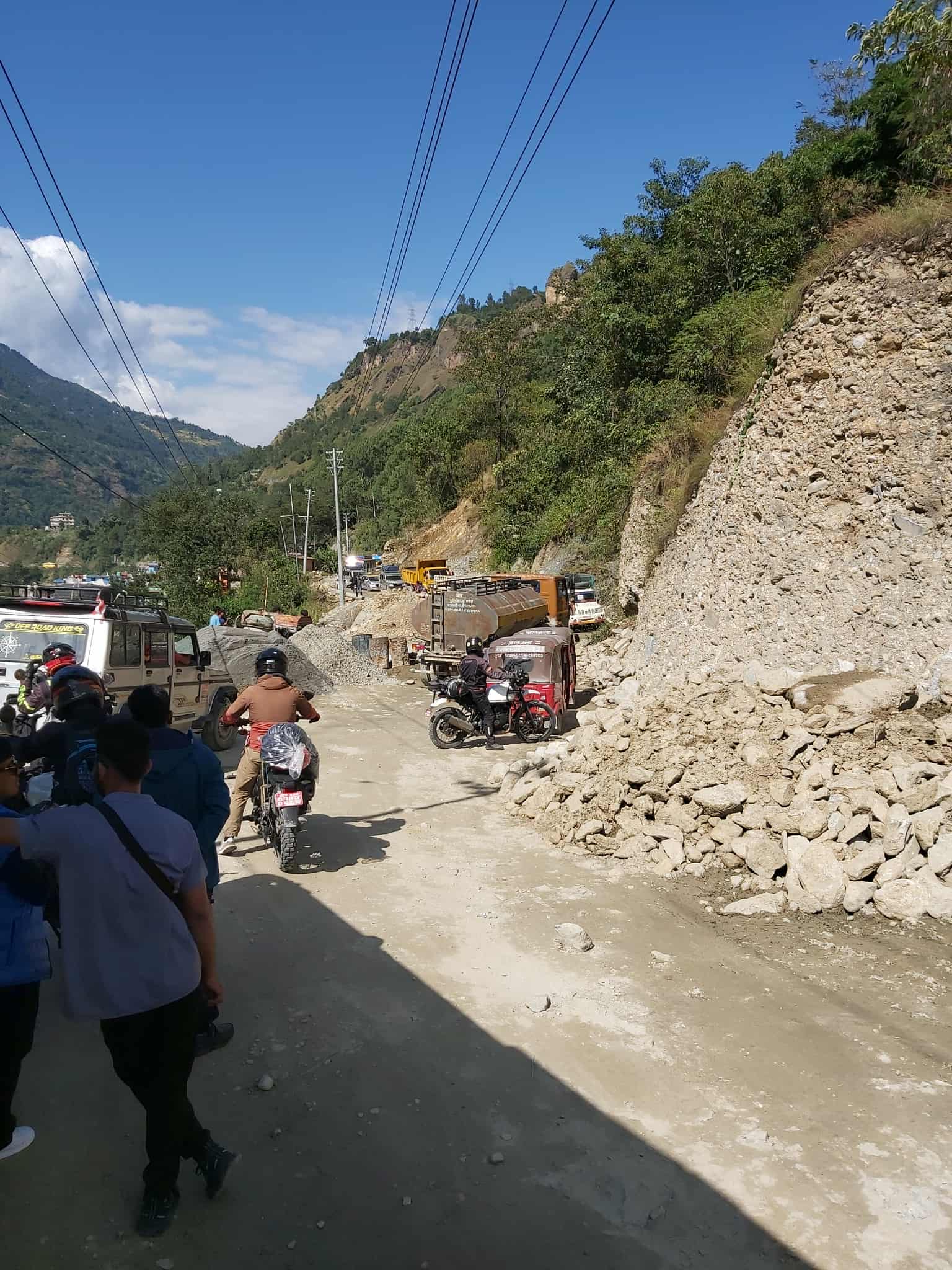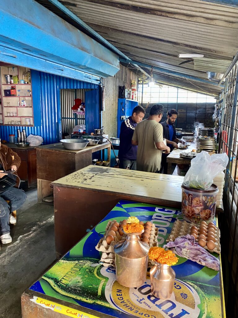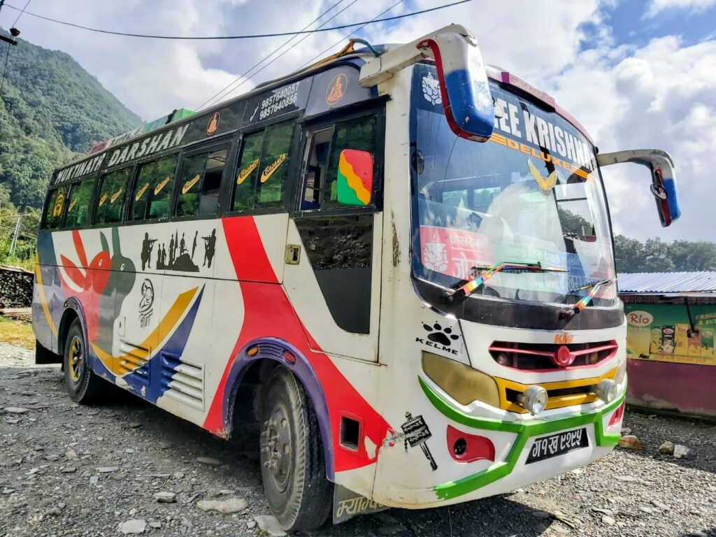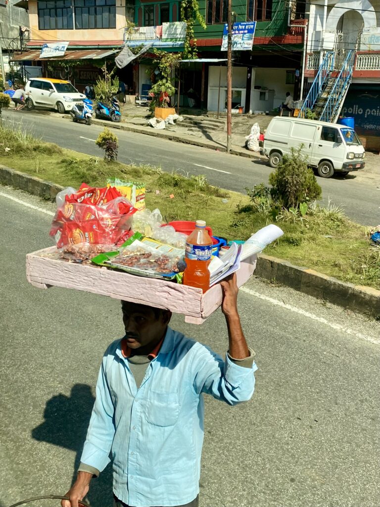 Bussen till vandringen i Galeshwor är knappt 10 mil och tog 4,5 timme,. Vägarna är verkligen inte bra, och sista sträckan hade drabbats av jordskred som bildade köer i den smala passagen. Dagen var härligt varm och vi svettades rejält. Spännande att kolla på vardagslivet som flyter förbi bussfönstret. Alla göromål sker enkelt med enkla hjälpmedel, som att all mat på de små restaurangerna alltid görs på beställning från ”scratch”. Jag ser förundrat på en man som ”tillverkar” byggställningar av bambu, eller en gatuförsäljare som blandar till en strut snacks till oss busspassagerare.