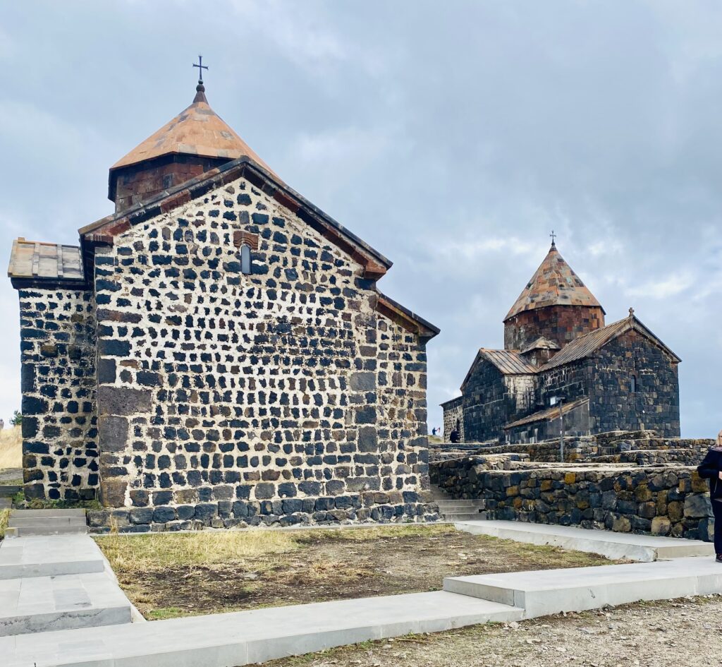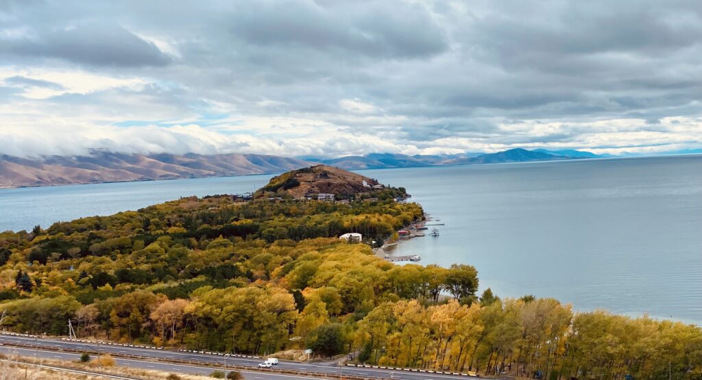 Hu, hösten har verkligen kommit här på 2.000 meters höjd. Träden är vackert rostfärgade, människor bär täckjackor och vi tar på oss allt vi har inför vandringen till Sevanavankklostret och gärna längs den omtalade stranden.